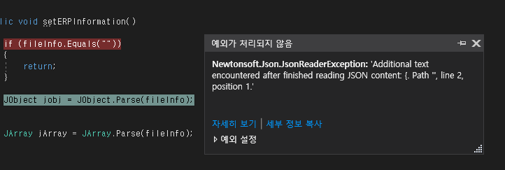 만약 위의 예시처럼 2개의 JSON형식의 string이 있다고 생각합시다. 그럼 이 string을 갖고 JObject를 하면 어떻게 될까요?