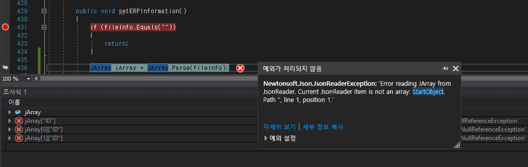 위와같이 array를 읽는데에 오류가 나는것을 확인할 수 있습니다. 오류의 내용은 배열이 아니라는 의미