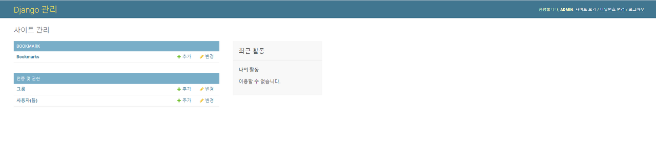 아까 관리자 권한을 준 username과 password로 admin사이트에 접속을 해봅니다. 그럼 제가 새로 만들었던 Bookmark app이 보이는 것을 확인할 수 있습니다.