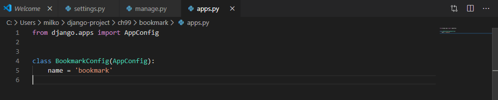 (dJangoVenv) C:\Users\milko\django-project\ch99>python manage.py startapp bookmark