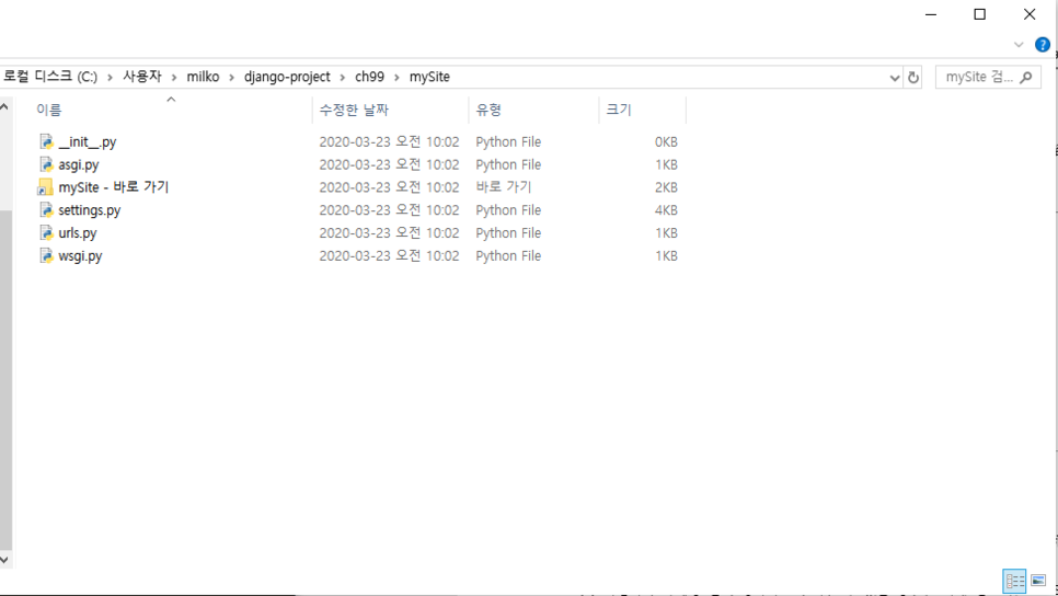 # 새로운 프로젝트 mySite를 생성해줍니다.