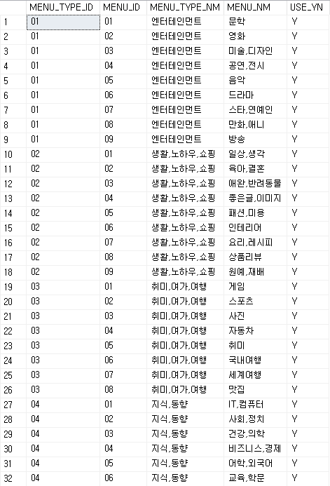 위의 사진은 MENU_INFO 테이블입니다. MENU_TYPE_NM은 대분류, MENU_NM은 소분류로 구분하여 만들었습니다. 해당 내용은 네이버 블로그와 동일하게 이 카테고리가 어떤 테마를 갖고있는 카테고리인지를 알기 위해 만들었습니다.