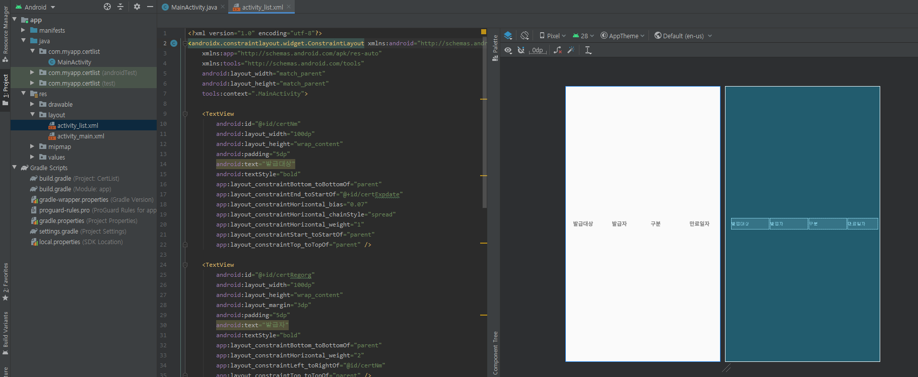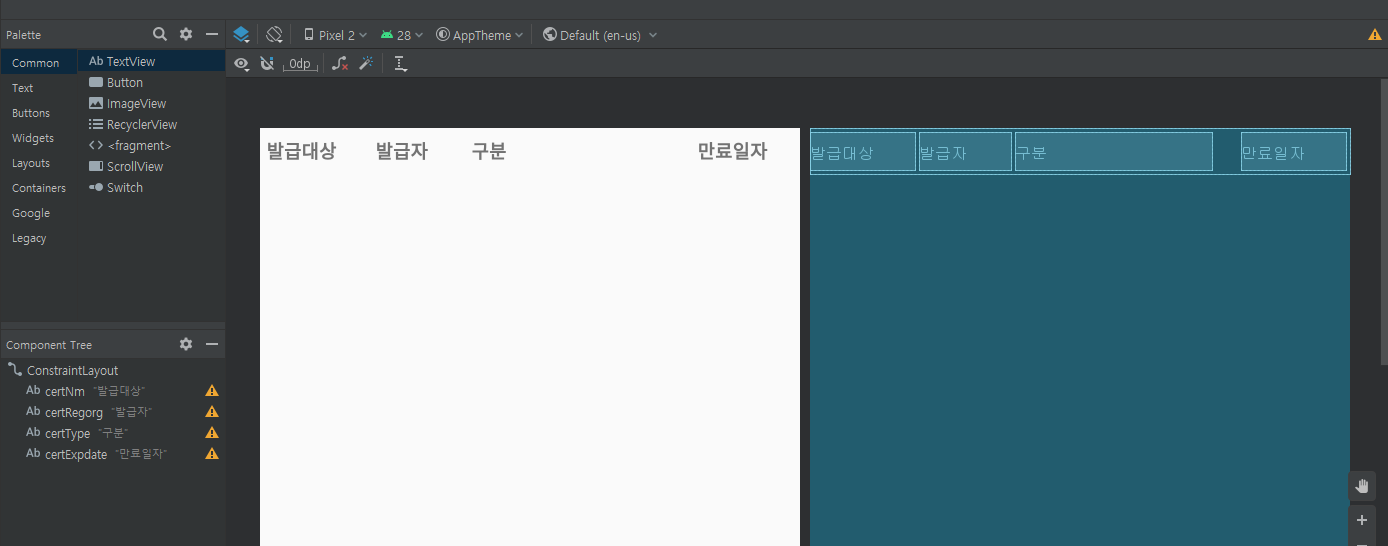 다시 activity_list.xml로 가서 아무것도 설정하지 않았던 빈 View에 본인이 넣을 TextView를 추가로 합니다. 저같은 경우에는 인증서정보를 보여줄 것이라 발급대상, 발급자, 구분, 만료일자 TextView를 생성하였습니다.