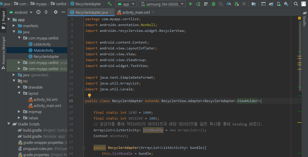 이제 RecylcerAdapter를 활용할 수 있게되었습니다. 아까 MainActivity에서 생성만 했던 RecyclerAdapter를 바꿔주도록 합시다.