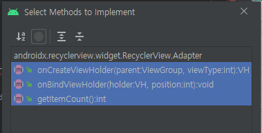 그 다음에는 방금 만들었던 ViewHolder를 상위 클래스에 extends해주세요. 만약 위와 같이 소스를 추가했으면 빨간줄이 뜨는데 Alt + Enter를 누르시면 이번에는 implement method를 생성하라는 문구가 뜹니다. 추가해주세요.