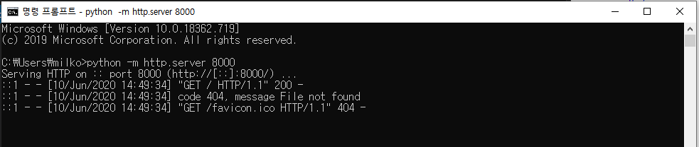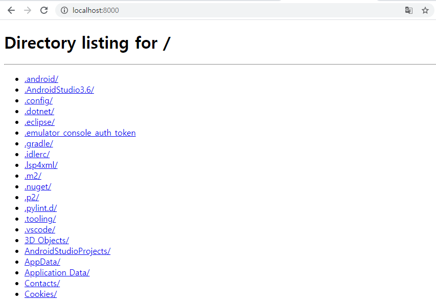 만약 index.html 파일이 없거나 cmd창에서 해당 파일 경로로 이동 안한 다음 웹서버를 구동시키면 위의 사진과 같이 파일시스템에 접근하게 됩니다.