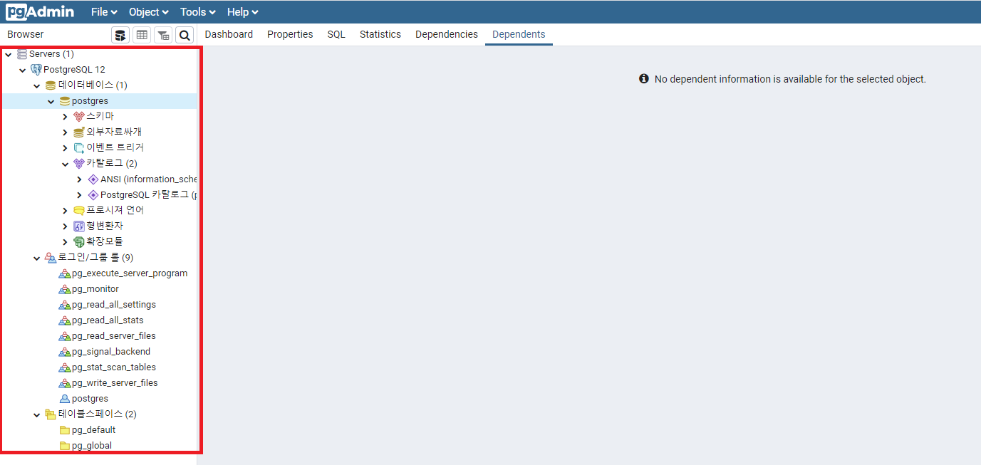 PostgreSQL : pgAdmin 화면 영어를 한글로 변경하기 본문