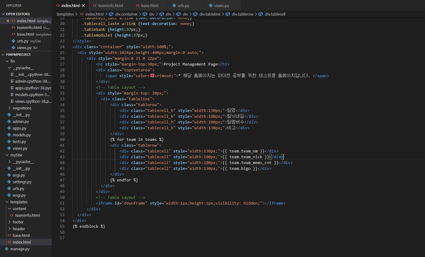 위의 소스는 뼈대로 만든 화면, 메인화면, 팀정보를 나타내는 화면입니다. base.html를 제외한 나머지 화면은 {% block content %}로 묶여있는 것을 확인할 수 있습니다.